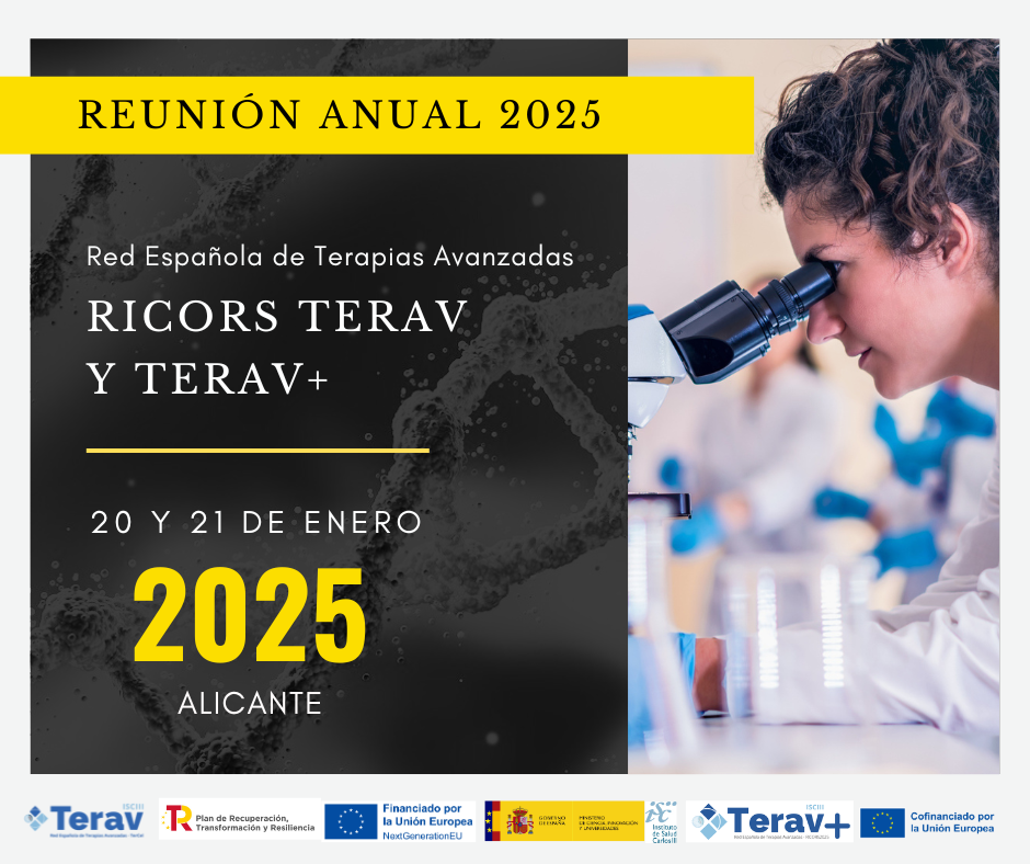 Los días 20 y 21 de noviembre la Red Española de Terapias Avanzadas (RICORS/TERAV) celebra su última Reunión Anual en la ciudad de Alicante, y en la que cederá el testigo a la nueva RICORS/TERAV+. Este encuentro, que congregará a más de un centenar de investigadores expertos en terapias avanzadas, supone una inmejorable ocasión para el intercambio de conocimientos e intereses científicos, así como para establecer nuevas líneas de cooperación y su traslación al Sistema Nacional de Salud para el beneficio de los pacientes.
